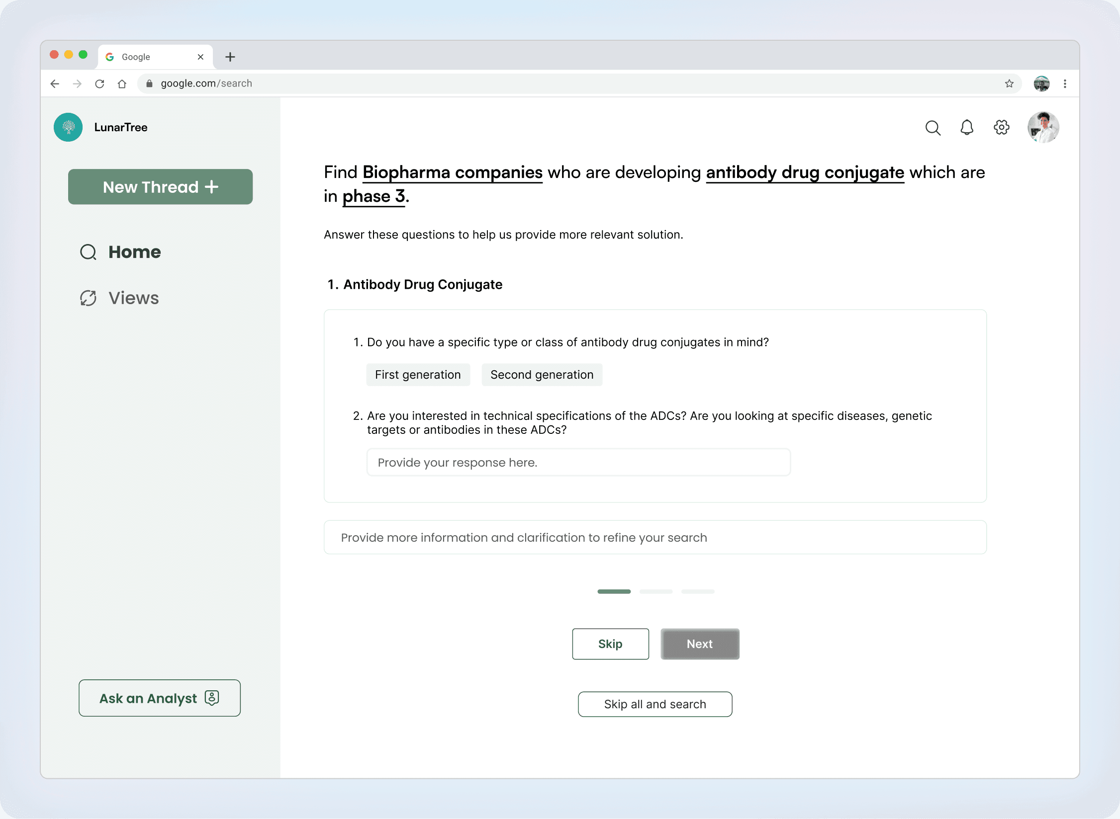 LunarTree is an AI-powered bio-pharmaceutical intelligence platform designed to accelerate life sciences research and decision-making. Our agency created this 0-to-1 solution for LunarTree, unifying scattered data from clinical trials, pre-clinical studies, companies, and conferences into personalized, AI-driven insights tailored for researchers, pharmaceutical teams, and consultants.