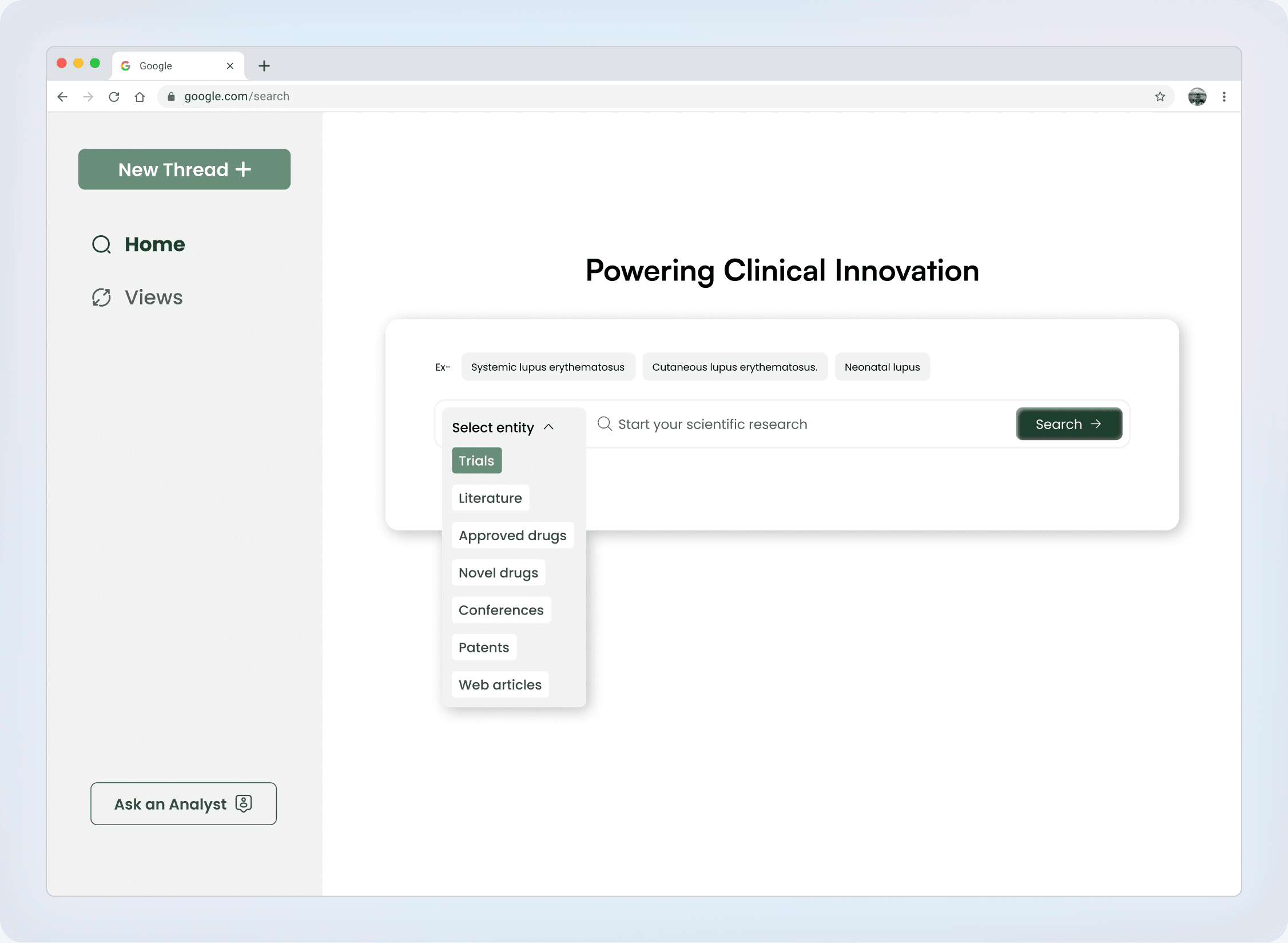 A single search bar powers research across multiple entity types (trials, literature, approved drugs, patents, and more), so users can switch context without rebuilding queries.