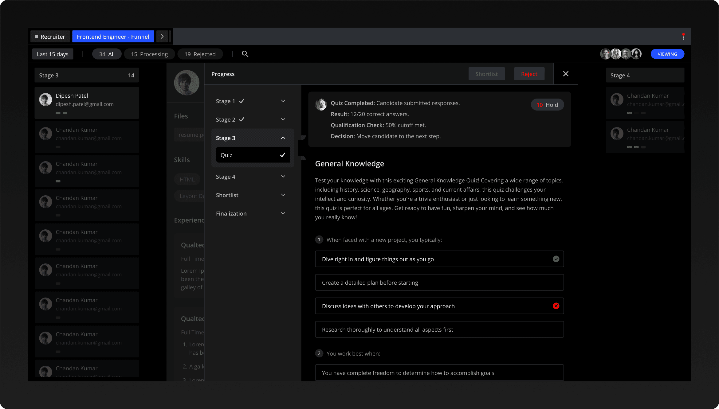 HR professionals can customize questions, monitor progress, and move candidates forward with ease, reducing back-and-forth while maintaining high-touch communication.