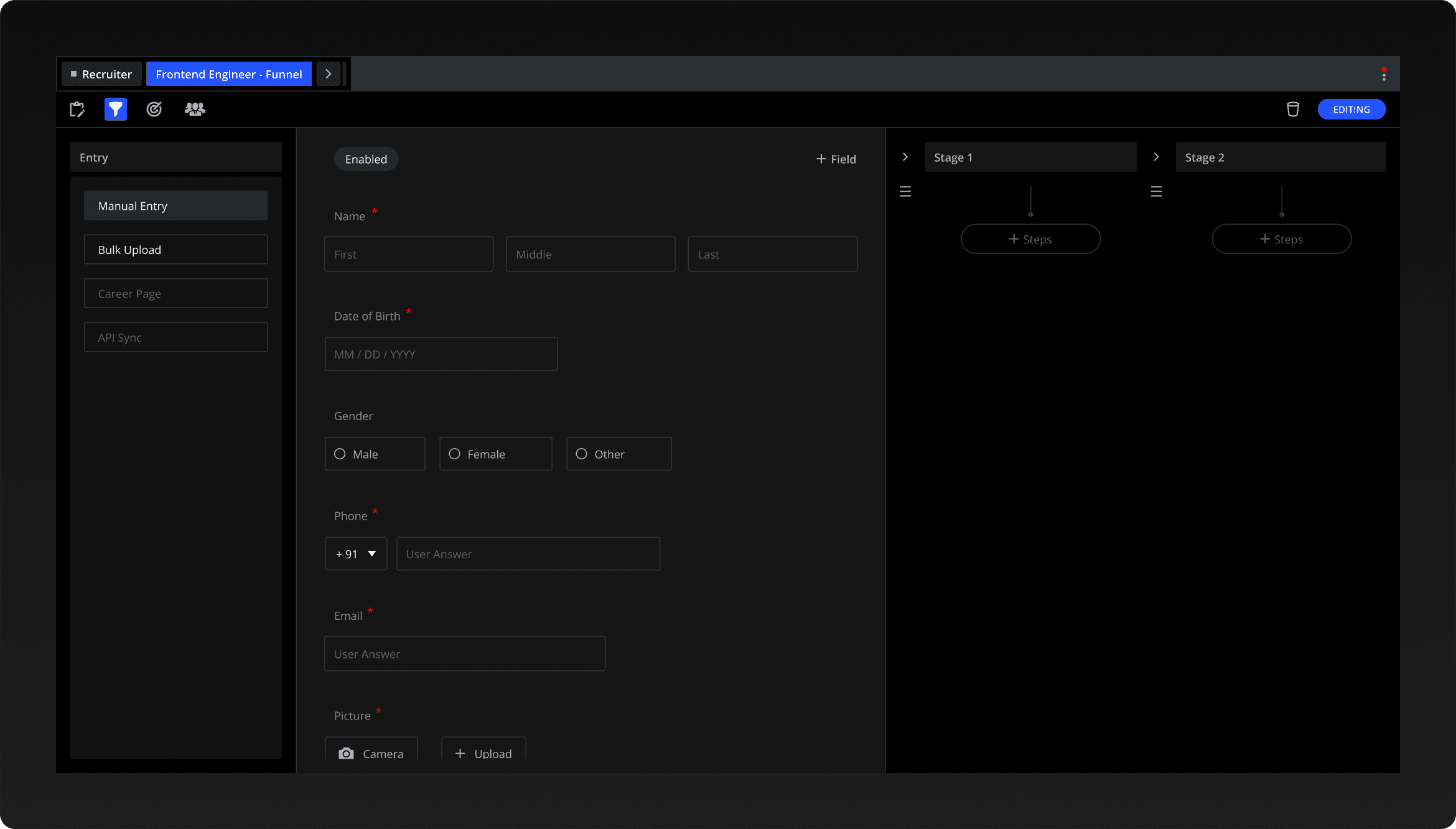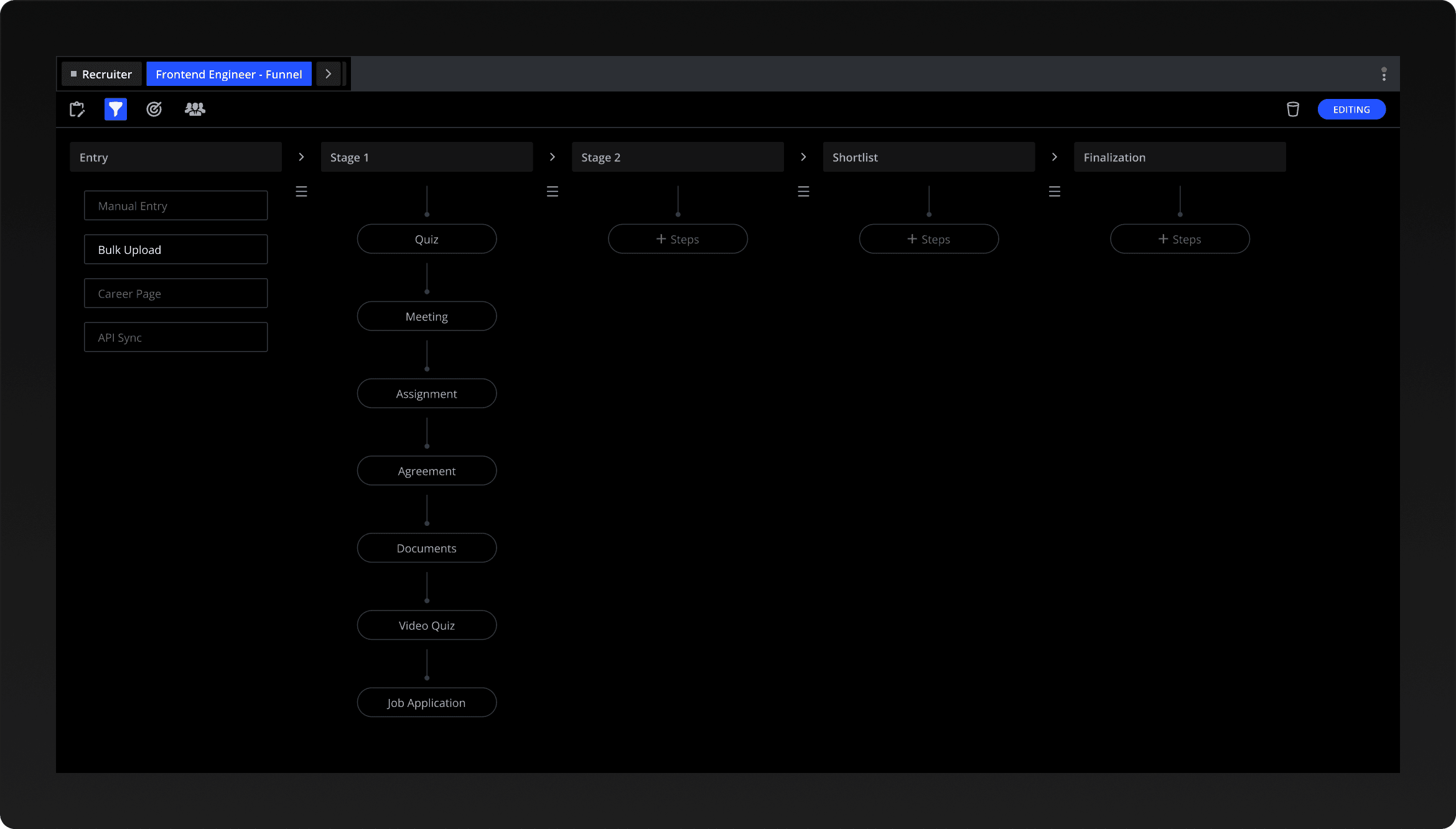 This workspace enables HR professionals to configure hiring funnels—defining stages, assigning tasks, and setting up role-specific screening questions.
