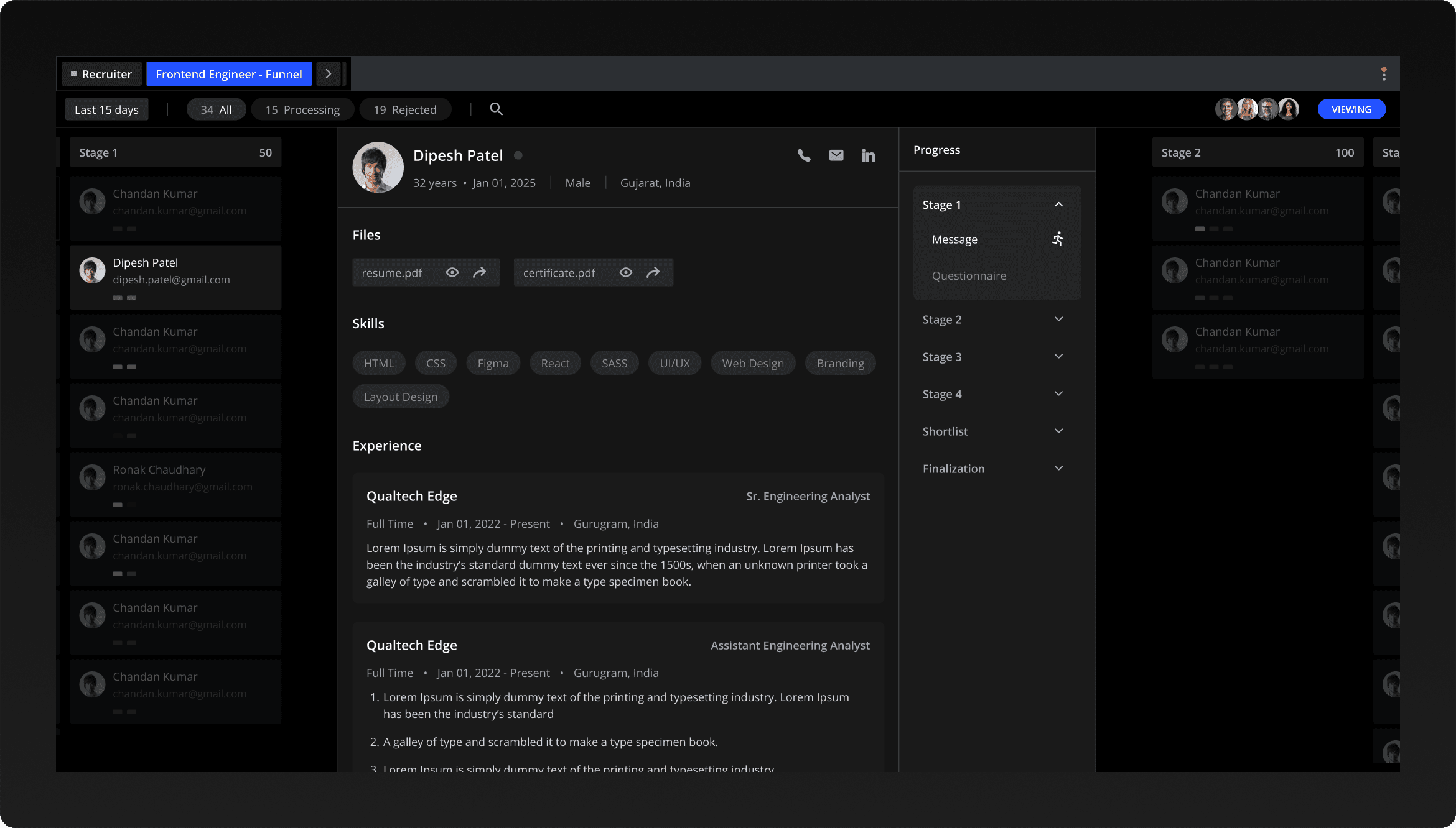 The system allows recruiters to add candidates, assign them to job-specific workflows, and guide them through each hiring stage with structured, trackable steps.